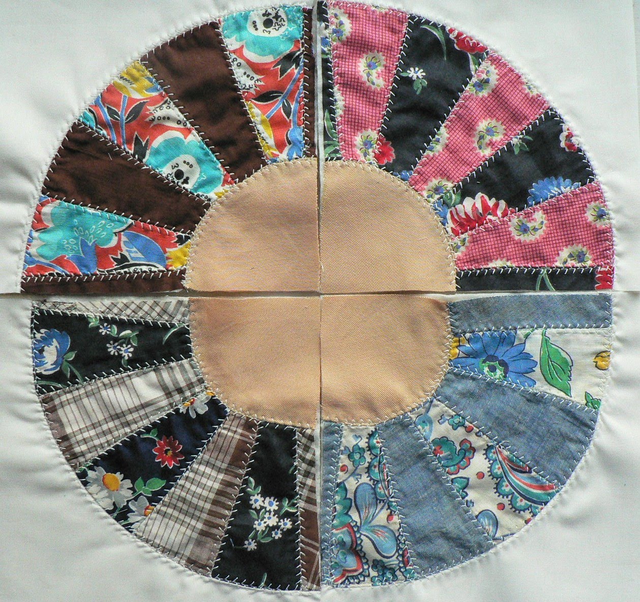 After insetting each fan quarter into the muslin piece, I then went back and embroidered along the seams. I originally planned to do different color thread with different patterns, but ultimately decided that off-white would compliment the quilt best. Also, by keeping the embroidery simple, I think it helps unify the quilt. While doing the embroidery I quilted each fan to a piece of batting.